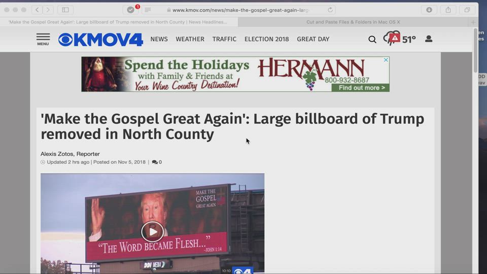 Monday, November 5 2018 - One day before the important mid-term election a billboard ad in St. Louis Missouri area featuring President Trump was REMOVED for .'....its political nature....' HMMM?