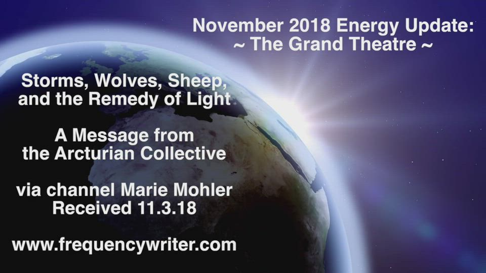 Storms, wolves, sheep, illusions, duality, and the Great Remedy of Light are themes in this November 2018 Energy Update channeled by Marie Mohler. The energies expose and reveal the Grand Theatre and "Film" of the old 3D earth. The energies also call us to increasingly activate our Higher Light and Soul Sight in order to step out of the audience of the 3D "show" and to move more steadily, confidently, and committedly into the Light of 5D cooperation, kindness, transparency, hope, and healing.