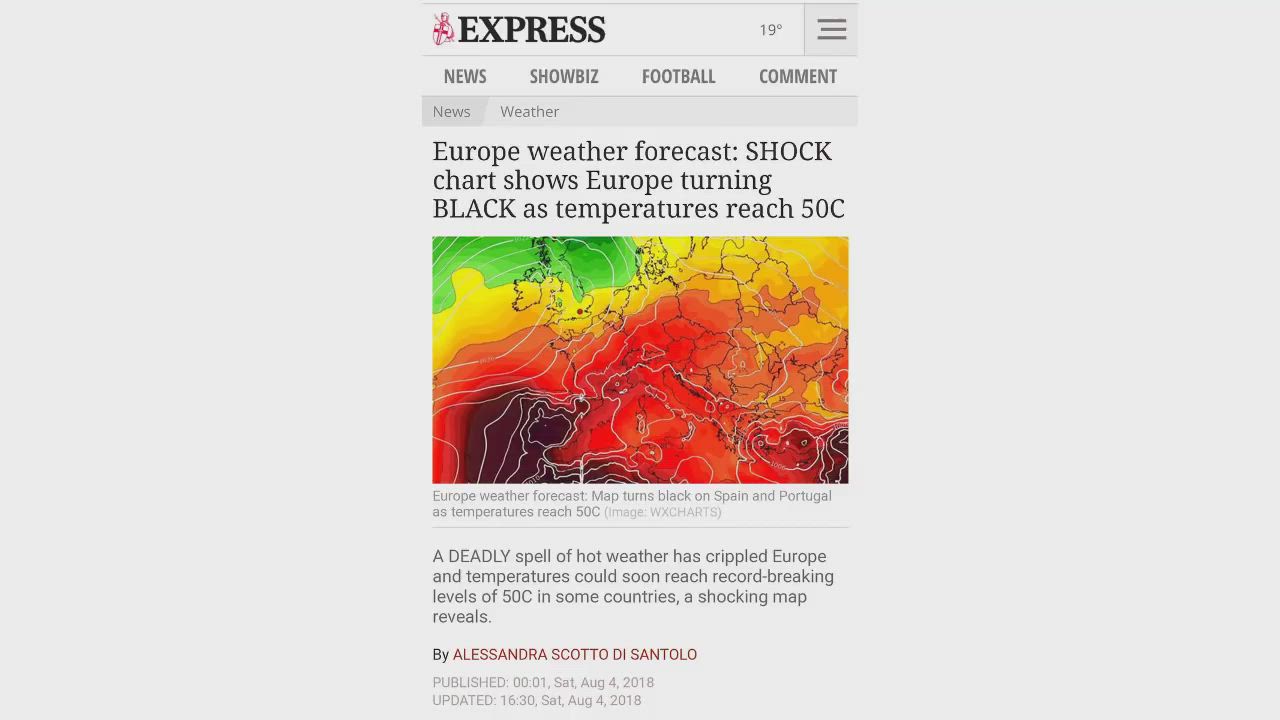 With the media over the last week screaming the world is frying and scaring the Europeans saying it would be over 50C which is over 125F this all turned out to be false. The hottest in Spain was 46C at one location with a host of others at 45C and everything else below that, and those were only 2pm day time temps, it got cool in the evenings to the high 80F range or 28-30C.