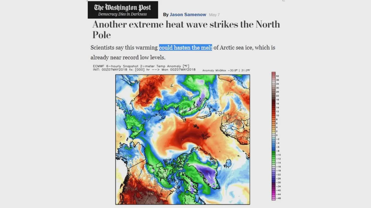 Washington Post article out showing heat wave in the Arctic claiming that these temperatures "could" help melt the Arctic while claiming record heat wave. Looking at a bevy of sea ice data from several agencies, it looks like this year is actually increasing, which is interesting. Also huge hail / snow storm a "snail" or a "hnow" storm baffles rescue crews and onlookers as hail and snow fall at the same time.