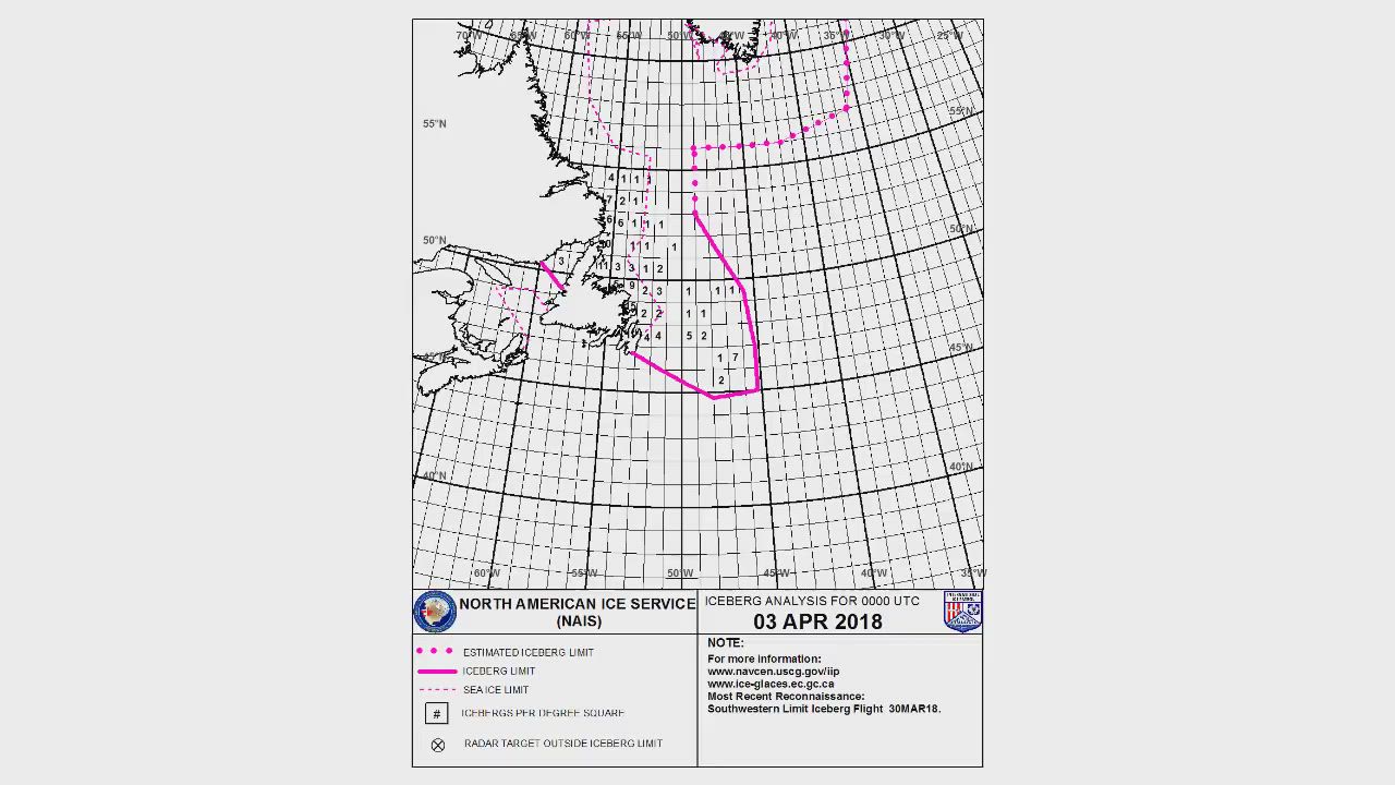 The North Atlantic Iceberg season is off to a 3 times above average start. This is because of an ice arc forming near Baffin Island the last known seed point for glaciation on our planet. This jams ice floew behind which create massive icebergs, and this season is the heaviest of the last five "heavy iceberg" seasons. So expect ice until late June or longer.