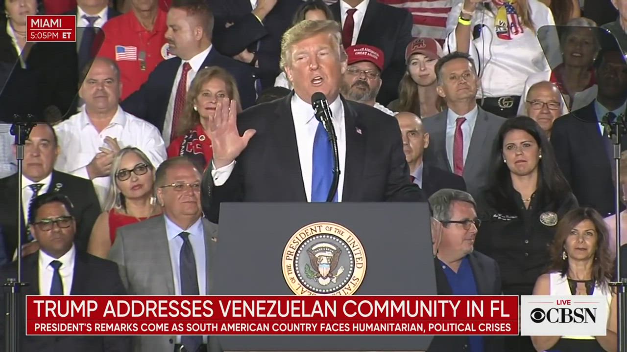 Speaking to a gathering of Venezuelan Americans in Florida, President Trump said humanitarian aid for the people of Venezuela has been stopped at the border. He called the nation's disputed president Nicolas Maduro a "Cuban puppet."