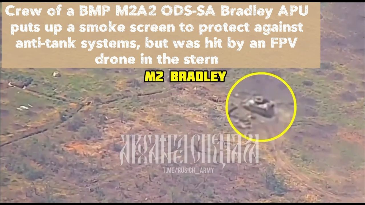 The crew of the BMP M2A2 ODS-SA Bradley APU put a smoke screen to protect against anti-tank systems, but was hit by an FPV drone in the stern.