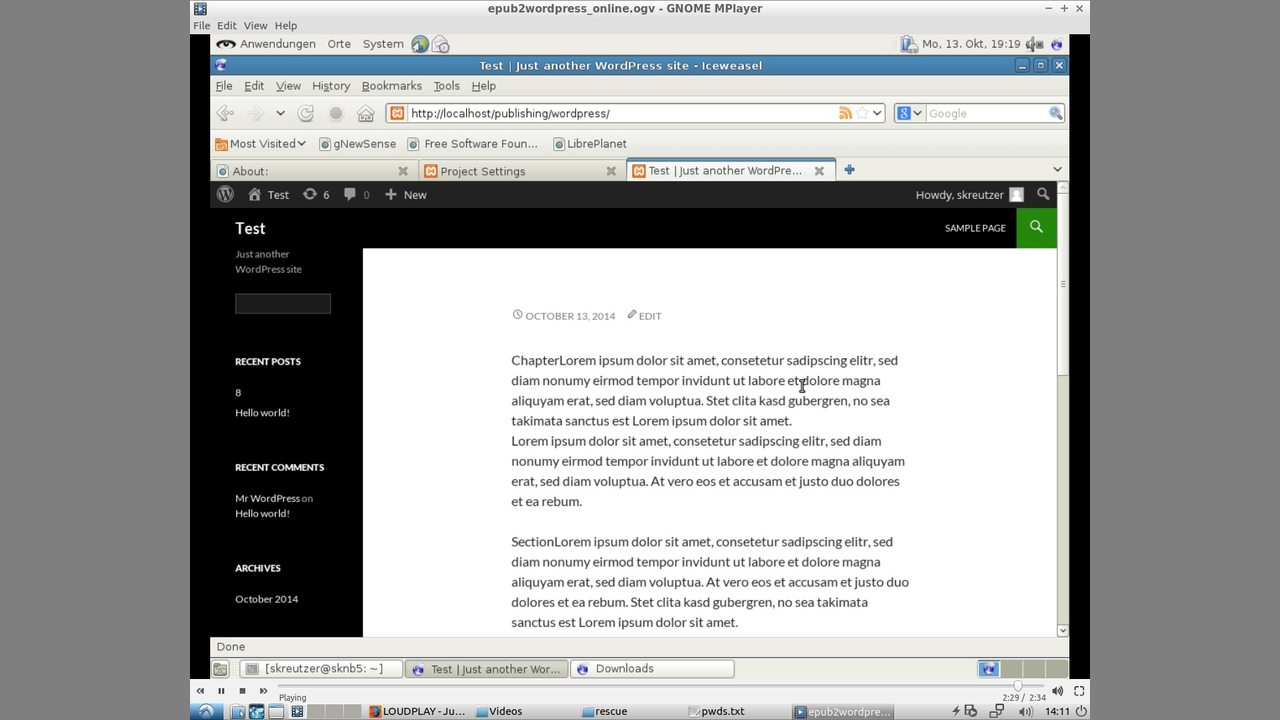 The freely licensed software (GNU AGPLv3 or later) shown in this video will enable a user to send an EPUB2 file to a WordPress installation. Users will be able to use WordPress as a publishing front-end, where the underlying software is part of a larger online publishing workflow (can be executed on a computer locally, too). With WordPress, lots of freely licensed plugins and themes are available and therefore can be applied onto the text quite easily.