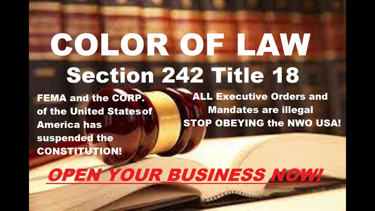 ALL Executive Orders and Mandates that strip you of your CONSTITUTIONAL RIGHTS ARE ILLEGAL! "WHY" are you continuing to accept the agenda of your enslavement and obeying the NWO corporation of the illegal United States of America? 60% OF SMALL BUSINESS IS ALREADY GONE FOREVER! YOU NEED TO IN LARGE NUMBERS UNITE AND "ALL AT ONCE", JUST OPEN YOUR BUSINESS!" For documents and forms to file for violation of Color of Law under Section 242 Title 18 contact us at: