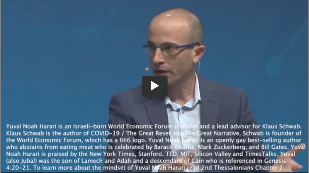 Yuval Noah Harari is an Israeli-born World Economic Forum member and a lead advisor for Klaus Schwab. Klaus Schwab is the author of COVID-19 / The Great Reset and The Great Narrative. Schwab is founder of the World Economic Forum, which has a 666 logo. Yuval Noah Harari is an openly gay best-selling author who abstains from eating meat who is celebrated by Barack Obama, Mark Zuckerberg, and Bill Gates. Yuval Noah Harari is praised by the New York Times, Stanford, TED, MIT, Silicon Valley and TimesTalks. Yuval is a Hebrew first name which means “father of music,” stream, brook, or tributary. In the Hebrew Bible, Yuval (also Jubal) was the son of Lamech and Adah and a descendant of Cain who is referenced in Genesis 4:20-21. To learn more about the mindset of Yuval Noah Harari read 2nd Thessalonians Chapter 2.