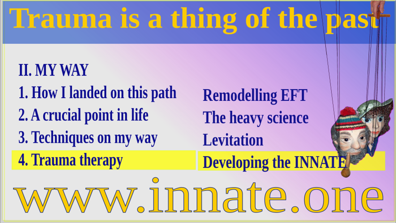 Even processes that have been paralysed for decades—karmic topics as well—may be found, understood and brought to a happy end. To restrict the use of the term trauma to broken legs and war veterans terrible experiences blinds us and blocks us from becoming healthy and happy. As it turns out, correcting one tiny word from your childhood may be a game changer. We simply need a tool to find the essence of it and a tool to mend it with. This is the INNATE Method.