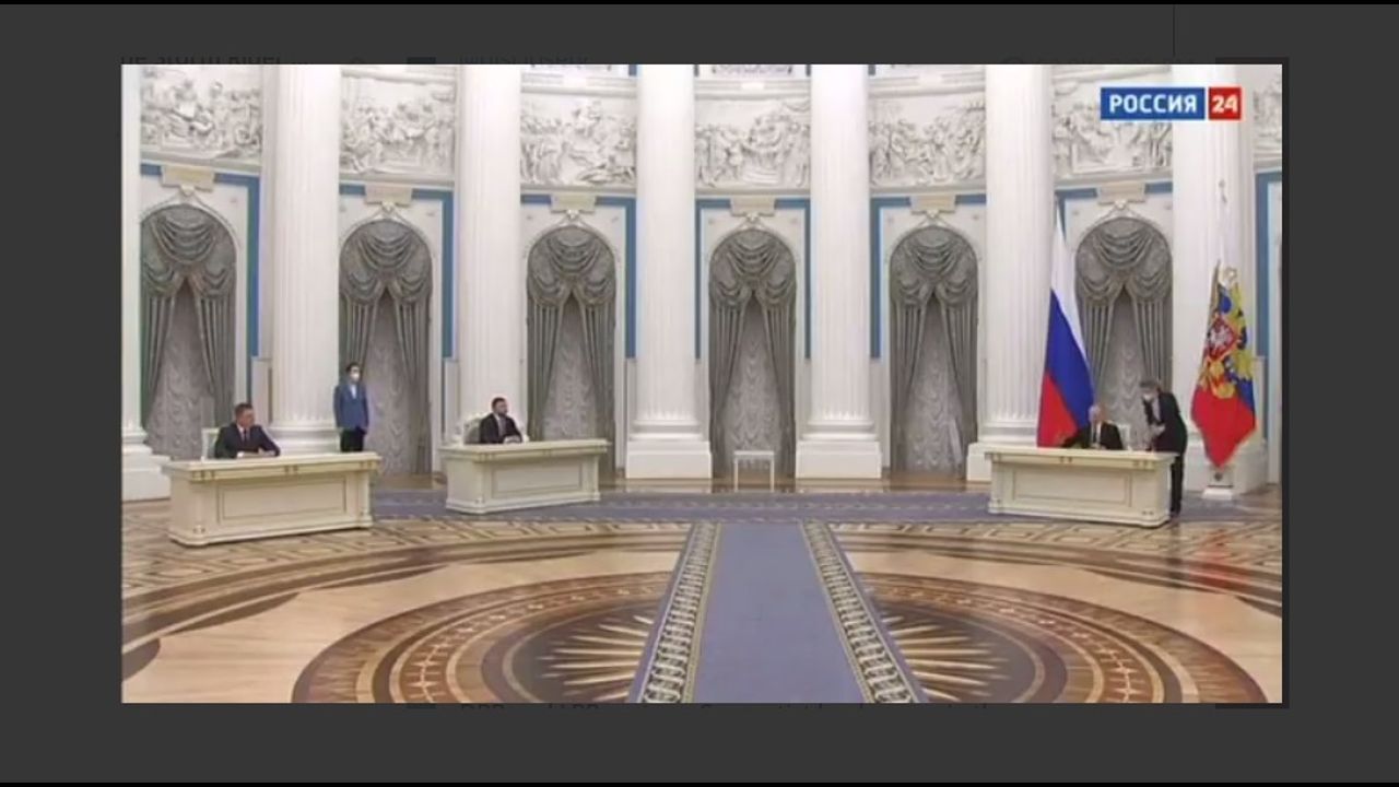 Putin signs the decree that recognizes the independence of DPR and LPR regions. Separatist leaders are in the room.