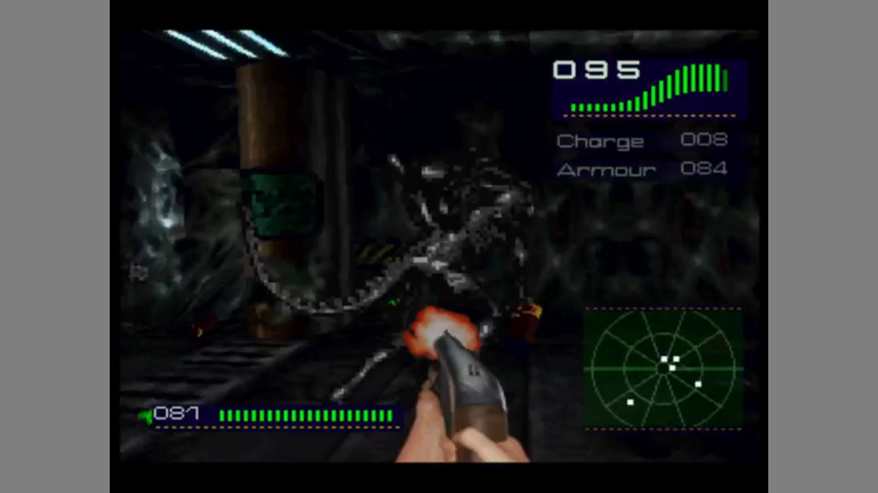 Alien Trilogy is first person shooter based on the (at this time) three Alien movies. It was developed by British company Probe Entertainment and published by Acclaim. The game came also out for PC and for the Playstation. You play the heroine of the saga, Alan Ripley, and start off at the colony from the film Aliens. Later levels take place at locations from the other two movies. The levels of the game are missions which come with an objective each, like taking out all enemies or activating power sources. Enemies in the game are taken from the movies, like Facehuggers, infected colonists and the original Alien.