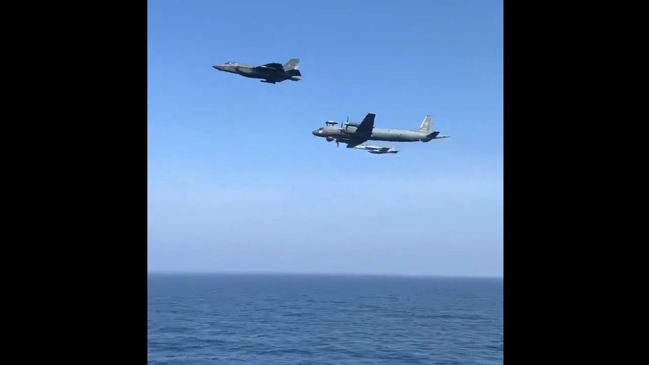 The footage, allegedly filmed by the Russian crew, captures a close pass by a US F-35C Lightning II under the Russian plane's left wing. Below the Russian aircraft, the massive US warship is clearly visible.