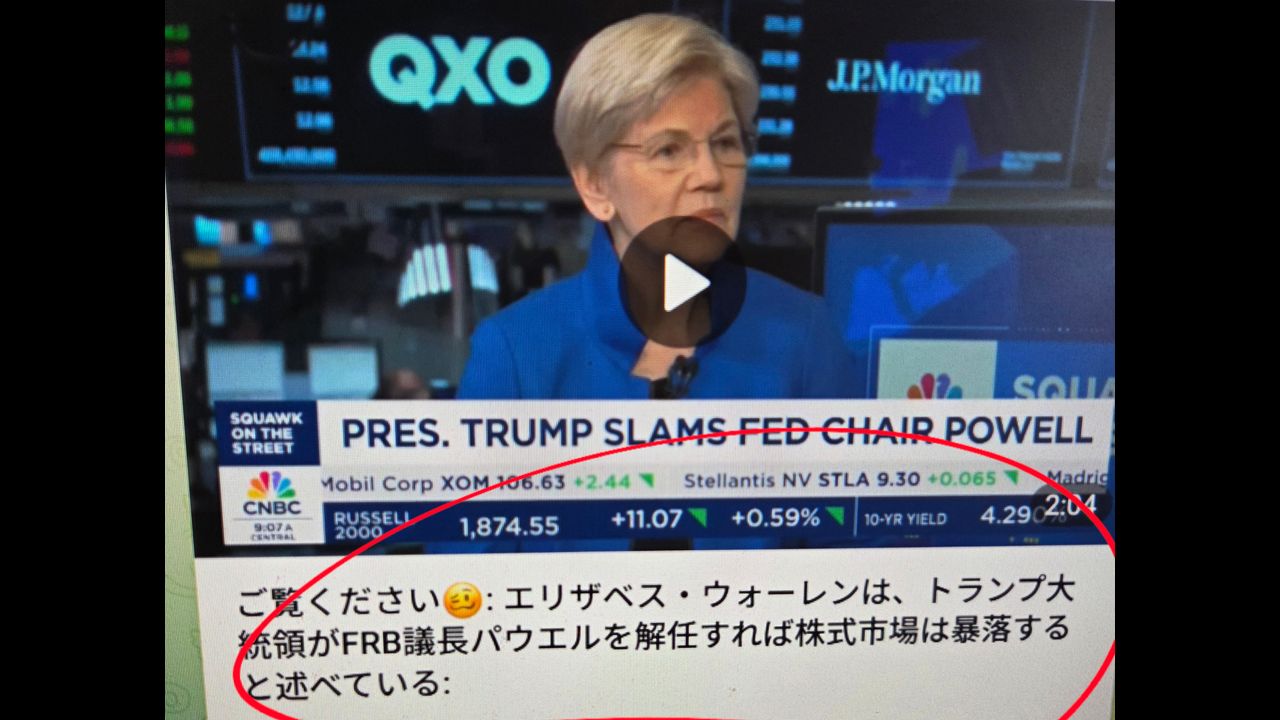 エリザベス・ウォーレンは、トランプ大統領がFRB議長パウエルを解任すれば株式市場は暴落すると述べている
