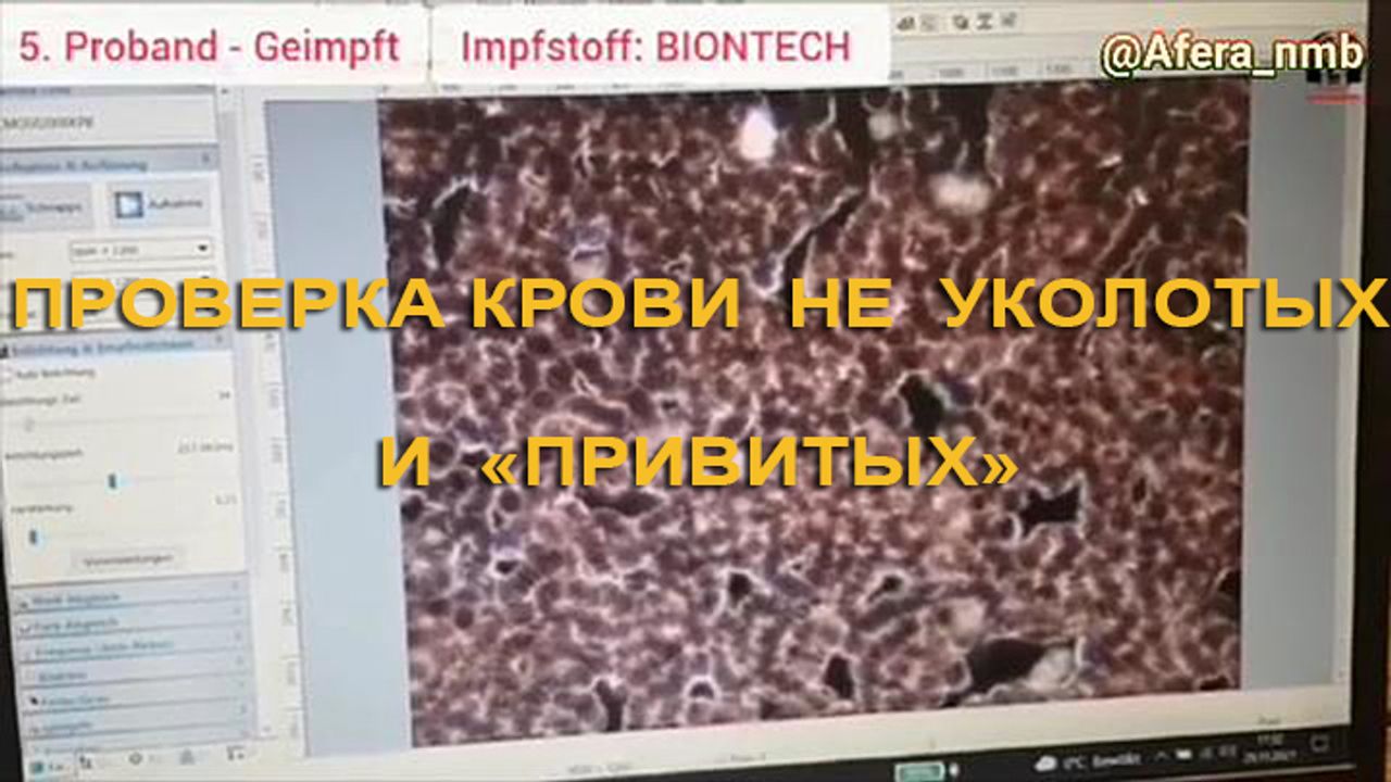 "Посмотрите своими глазами, — на видео 7 человек сдают кровь, 3 не вакцинированы, а 4 уколоты «вакцинами» Pfizer (Biontech) и Moderna, проверяется состояние их эритроцитов — у вакцинированных эритроцыты слиплись, так образуется тромбоз, в несколько раз сгущается кровь" (в некоторых случаях на 300%).