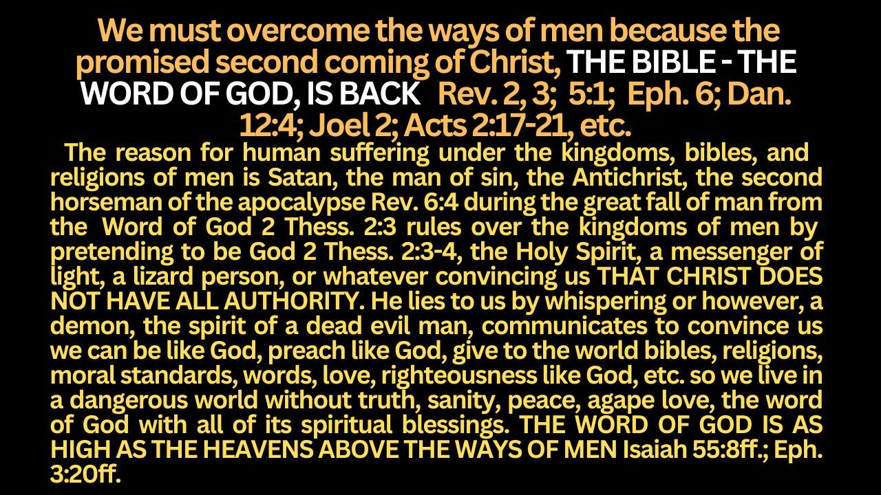 We must overcome the ways of men because the promised second coming of Christ, THE BIBLE - THE WORD OF GOD, IS BACK Rev. 2, 3; 5:1; Eph. 6; Dan. 12:4; Joel 2; Acts 2:17-21, etc.
