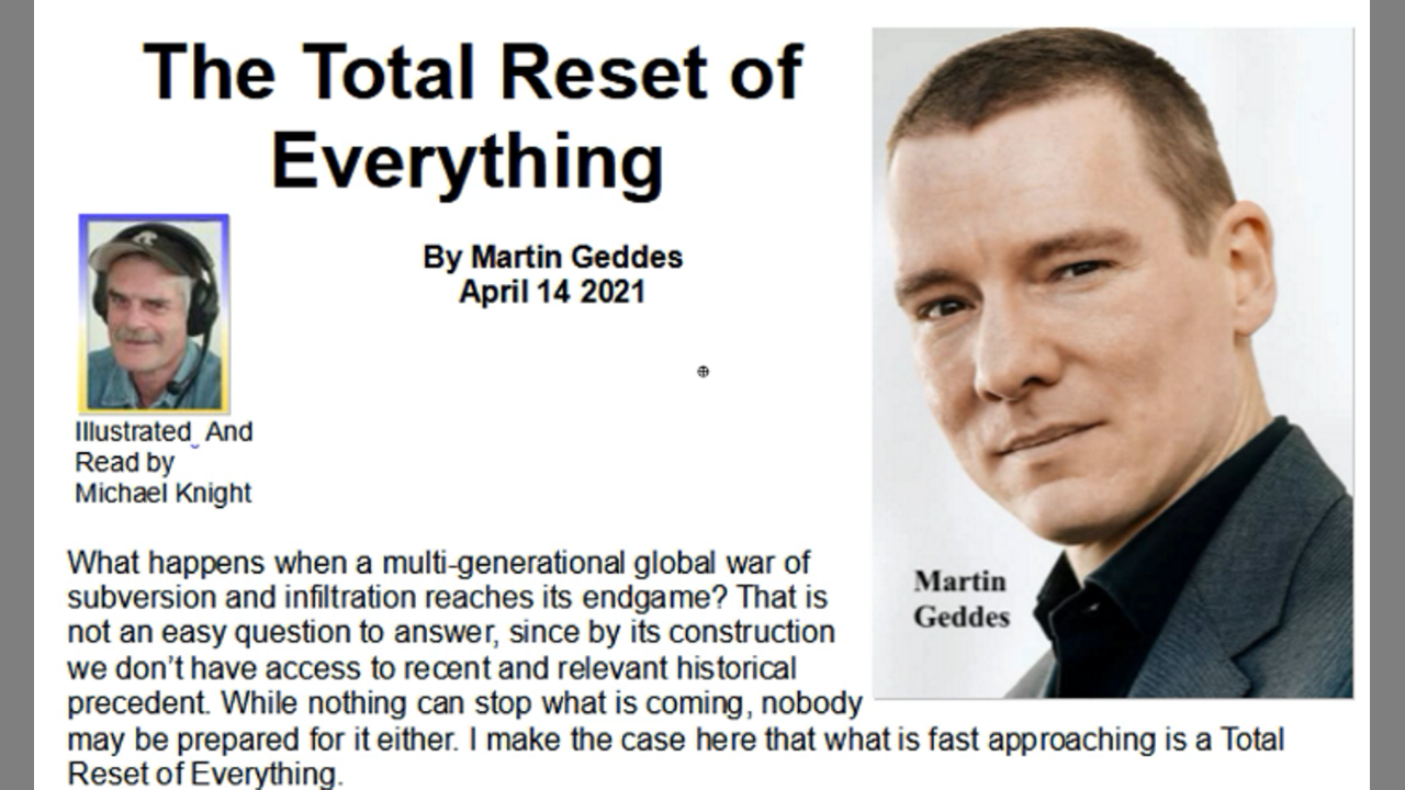 In this extraordinary analysis of current - and potentially future - events, Martin Geddes touches multiple bases. Can you imagine China's Three Gorges Dam being "no more"? And the end of the Globalists' "Great Reset" instead of which - with their imminent demise - Geddes foresees a "Reset of Everything" - once this war is won. The essay is narrated and illustrated by Michael Knight. You are encouraged to share wherever you choose.