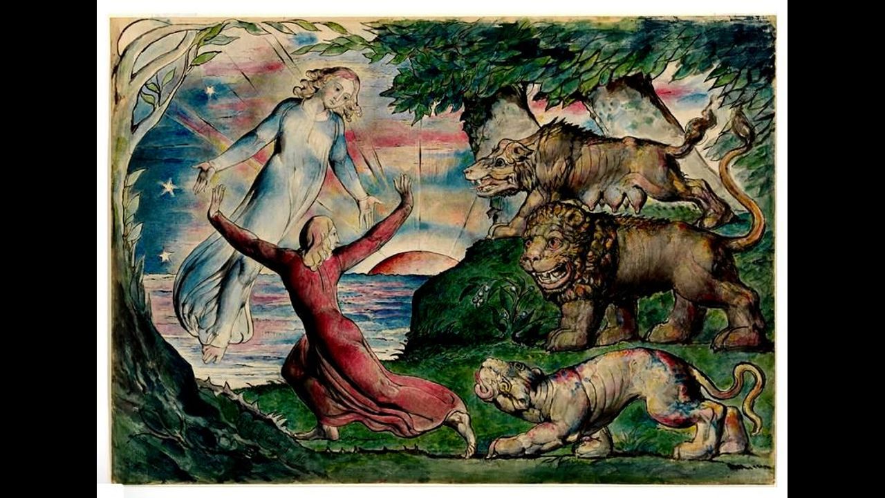 Front cover: Dante running from the 3 beasts of revelations https://www.tate.org.uk/art/artists/william-blake-39/blake-illustrations-dante