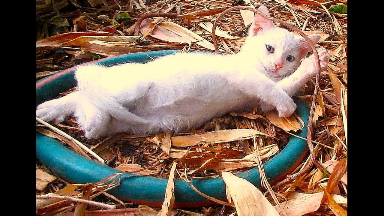 I’ve now named this taming stray kitten, ‘Tiny’, as it is half the size of its siblings, and it delights me every day. It has different coloured eyes.