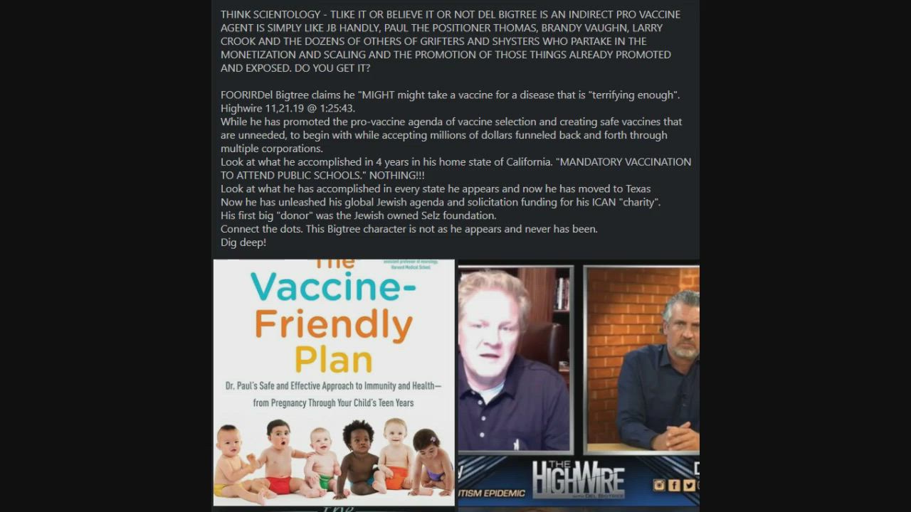 THINK SCIENTOLOGY - BELIEVE IT OR NOT, DEL BIGTREE IS AN INDIRECT PRO VACCINE AGENT LIKE LIKE HIS FRIENDS JB HANDLY, PAUL THE POISONER THOMAS MD, BRANDY VAUGHN, LARRY CROOK AND DOZENS OF OTHERS OF GRIFTERS AND SHYSTERS WHO PARTAKE IN THE MONETIZATION, SCALING, AND PROMOTION OF VACCINE INJURY. MOST OF WHICH HAVE ALREADY BEEN PROMOTED EXPOSED AND REPACKAGED. DO YOU GET IT?