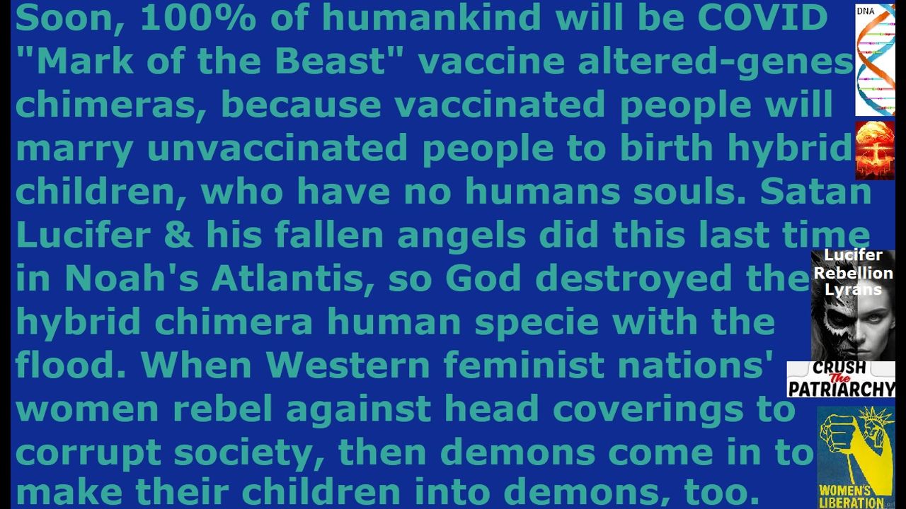 *** Intelligence news update from the Human Homo-Sapiens Race Survival Resistance (HRSR) headquarters and Republic Rebel Alliance battlefront (January 2025). Soon, 100% of humankind will be COVID "Mark of the Beast" vaccine altered-genes chimeras, because vaccinated people will marry unvaccinated people to birth hybrid children, who have no humans souls. Satan Lucifer & his fallen angels did this last time in Noah's Atlantis, so God destroyed the hybrid chimera human specie with the flood. When Western feminist nations' women rebel against head coverings to corrupt society, then demons come in to make their children into demons, too. Preach this in your next Sunday church service sermon, so that all your church member with assassins will try to assassinate you and slaughter your genetic descendant idols, and 99% of your church donators will leave your church in disgust & anger & sheer terror, so that God’s house will be cleansed of their religious filth. Do it now and do not wait until tomorrow, unless you are a crazy lunatic who has lost all common sense of the Holy Spirit. Jesus died on the cross to atone for your sins, and he rose again, and he is seated on his throne in heaven reigning, so that whoever repents and receives him as Savior & Lord will receive forgiveness for sins and the gift of eternal life. Salvation is by free grace and faith in the atoning blood of Jesus, and not by wearing women's head coverings or abstaining from cross-dressing in men's pants or abstaining from extorting fake illegal tithe income tax. Repent and receive Jesus as Savior, and make straight the way of the Lord! These millions of Western feminist nations’ “Bible verses redefining, uncovered women's heads rebels, fallen angel head controlled, men’s pants cross-dressers androgynous transgender” fake Christians and millions of Nicolaitan clergy class laity class Satanist pagan religious system's "ordained & allowed & trained & non-assassination-attempts-receiving" fake unbiblical job position pastors absolutely hate speaking the tens of thousands of truths we real Christians shared to them, because they are afraid of getting cooked alive by CIA microwave oven weapons from next door homes & every hotel room every day, and getting shot with FBI pinpoint heart attack EMF weapons from next door homes & every hotel room, and getting poisoned by NSA sulfuric acid & polonium radiation & mercury & flesh-eating bacteria HIV biochemical weapons, and facing starvation & homelessness risks many times with only a few dollars left in their wallets, and having demon spirits sent to attack them all day long who rip in two their own Satanist Catholic exorcist priests, and having their heathen families either slaughtered or their brains controlled to try to kill them, and receiving witchcraft & psychic attacks to try to explode their hearts, and having CIA NSA MI6 FBI Freemason Jesuit Wicca Black Ops Satanist assassins trying to shoot them in the head in their apartment lobbies, and having their urethras and anuses and clitorises molested all day long by demons, and having tens of thousands of gang-stalkers shooting them with mobile phone EMP shock weapons in every room & toilet & shower & workplace & classroom & shop & restaurant & beach & park & forest every few minutes in the heart & brain & liver & genital & eyes & kidneys, and being microwaved by F-15 jets and drones and boats and dozens of CIA tinted-window white trucks all day, and having Satanists time traveling back into their childhood to try to kill them hundreds of times even before they are born, and hundreds of other persecutions. Instead, Satan Lucifer gives them something a lot worse, which is church music, and church food, and church theology, and church genetic propagation animal instinct preoccupation, and pastors’ illegal salaries stolen from 50% of the illegal 10% tithe income tax, and happy families, and love from church donators.