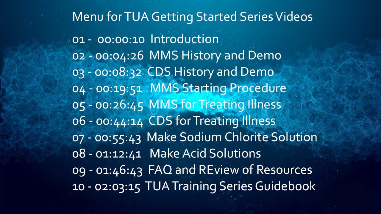 Menu for The Universal Antidote Getting Started Series Videos 01 - 00:00:10 Introduction 02 - 00:04:26 MMS History and Demo 03 - 00:08:32 CDS History and Demo 04 - 00:19:51 MMS Starting Procedure 05 - 00:26:45 MMS for Treating Illness 06 - 00:44:14 CDS for Treating Illness 07 - 00:55:43 Make Sodium Chlorite Solution 08 - 01:12:41 Make Acid Solutions 09 - 01:46:43 FAQ and REview of Resources 10 - 02:03:15 TUA Training Series Guidebook