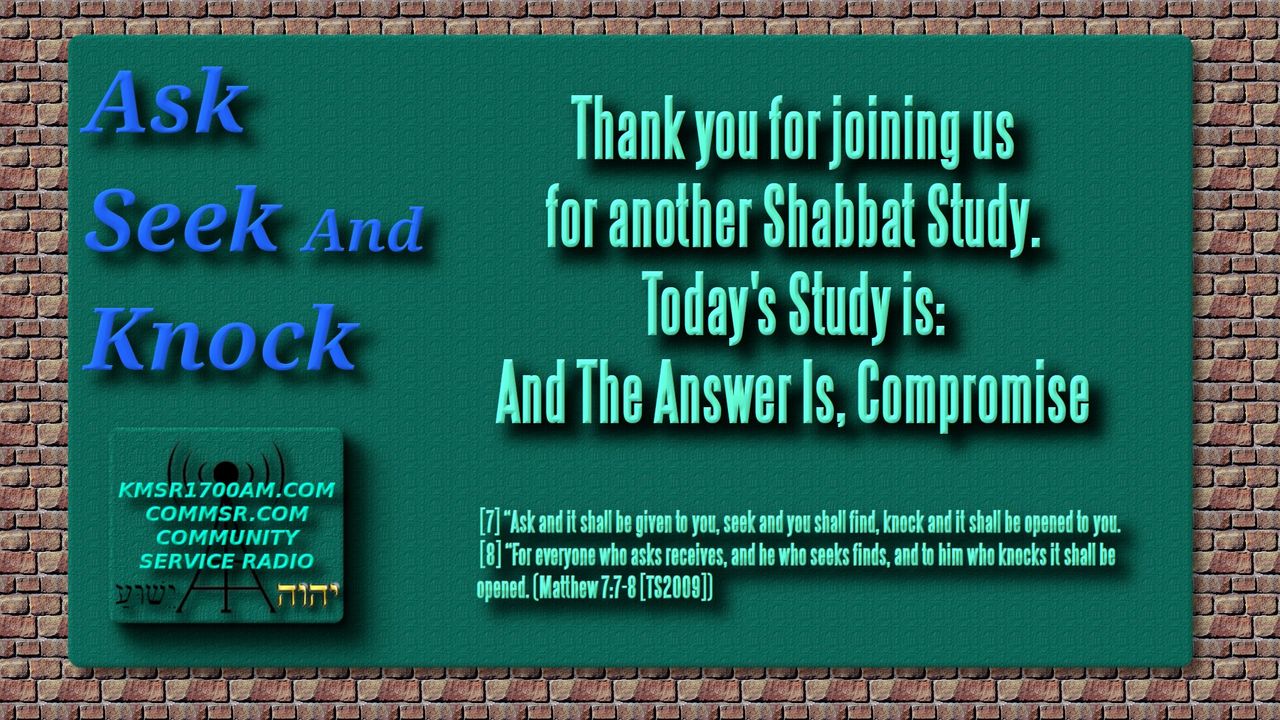 Thank you for Joining us with kmsr1700am.com for another addition of Ask Seek and Knock Shabbat Teachings. Today we discuss “And The Answer Is, Compromise”. Grab your highlighters and your Scriptures and lets get to it.