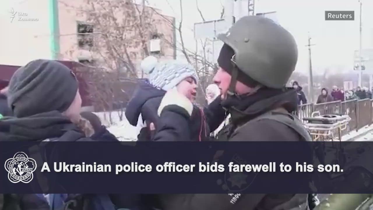 A Ukrainian police officer bids farewell to his son