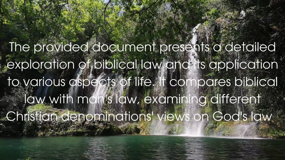 The provided document presents a detailed exploration of biblical law and its application to various aspects of life. It compares biblical law with man's law, examining different Christian denominations' views on God's law in contemporary society. The document also addresses constitutional rights, delving into areas such as challenging government statutes and righteous judgement. Blessings and curses within God's law are investigated, alongside discussions on law versus grace and the role of morality in legislation. Furthermore, the text examines God's sovereignty and man's authority, considering topics like true justice and subduing the earth. It also covers themes of hate and love and presents examples of each from the Bible, providing a comprehensive overview of biblical laws and their modern implications.