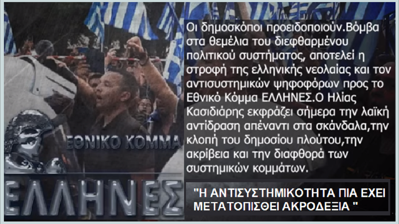 Οι δημοσκόποι προειδοποιούν: Βόμβα στα θεμέλια του διεφθαρμένου πολιτικού συστήματος, αποτελεί η στροφή της ελληνικής νεολαίας και των αντισυστημικών ψηφοφόρων προς το Εθνικό Κόμμα ΕΛΛΗΝΕΣ. Ο Ηλίας Κασιδιάρης εκφράζει σήμερα την λαϊκή αντίδραση απέναντι στα σκάνδαλα, την κλοπή του δημοσίου πλούτου, την ακρίβεια και την διαφθορά των συστημικών κομμάτων.