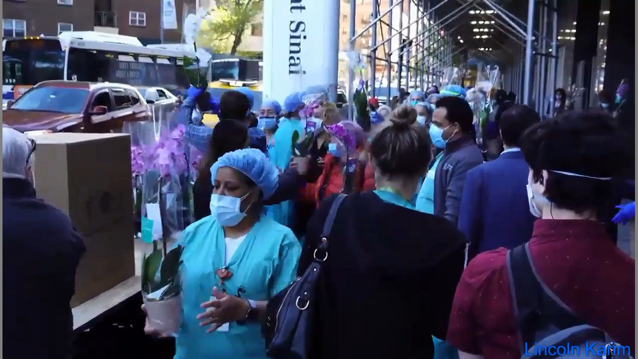 REPOST 5-7-20 NYC Mt Sinai Hospital Covid19 Social Distancing 6ft LIE Flowers Nurses Medical Staff
