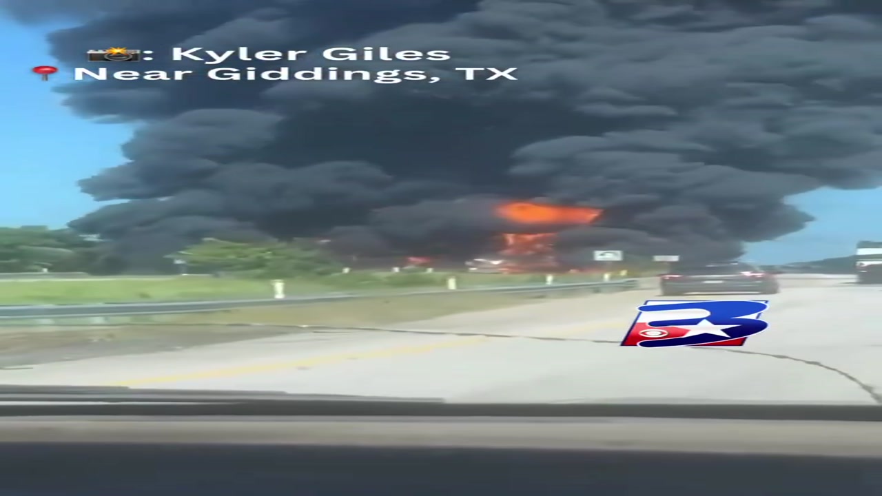 An oil tanker and at least one other vehicle are engulfed in flames on Highway 290 east of Giddings in Lee County, Texas.