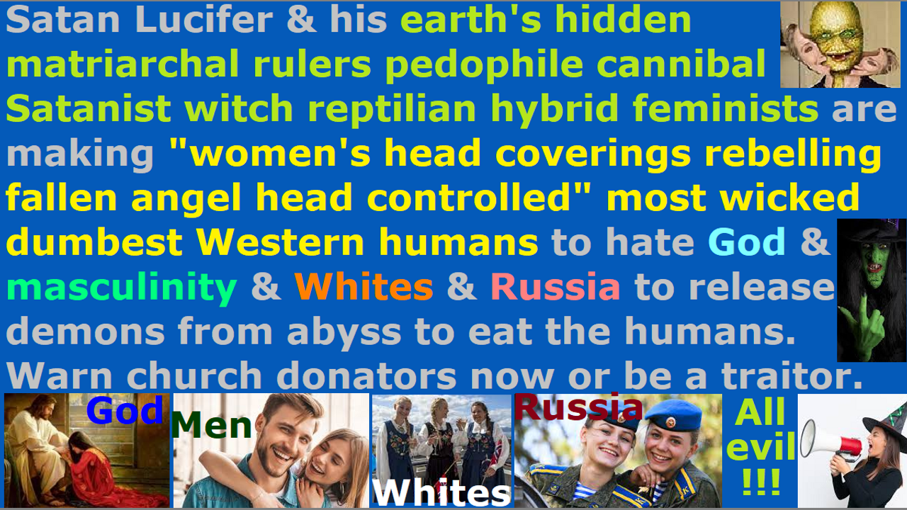 *** Intelligence news update from the Human Homo-Sapiens Race Survival Resistance (HRSR) headquarters and Republic Rebel Alliance battlefront (October 2022). Satan Lucifer & his earth's hidden matriarchal rulers pedophile cannibal Satanist witch reptilian hybrid feminists are making "women's head coverings rebelling fallen angel head controlled" most wicked dumbest humans to hate God & masculinity & Whites & Russia, in order to release millions of demons from the wormhole portals’ abyss to eat the humans. Warn your church donators now, or else, be a cowardly traitor and have the blood of 6 billion people on your hands. You should know already by the Holy Spirit if you are a real Christian that there are millions of human-eating demons and fallen angel devils being released into our earth now. We real Christians have been warning about this in our daily sermons every day for decades. You have no excuse to be silent and hide all of this from your church donators and 6 billion humans, just because you do not want to get assassinated or be ridiculed as a crazy lunatic by your church donators. If you do not warn them, then you are coconspirators with Satan Lucifer, and you are responsible for the deaths of 6 billion people and your church donators as a fake “Bible’s watchmen on the wall.” If you really want to insult God and try to appease both Satan Lucifer and God, then modify & dilute & sterilize & pick & choose & edit the truth, in order to make it safe for yourself from assassinations and slaughtered families and cooking alive from CIA microwave oven weapons from next door homes & rooms every day and income cut offs and demon attacks and ridicule from church donators. Do not dare scream and wail and blame God when you are getting eaten alive by all these vampires and werewolves and gargoyles and minotaur and Medusa and Godzilla titans that are being released into our earth and our realm. Preach this in your next Sunday church service sermon so that 99% of your church donators will leave your church in terror & anger & disgust, so that God’s house will be cleansed of their religious filth. Do it now and do not wait until tomorrow, unless you are some kind of Western feminist nations’ End Times apostate harlot Church’s fake pastor or a “Bible verses redefining women’s head coverings rebelling fallen angel head controlled” “Satan Lucifer’s post-1960s cross-dress-project men’s trousers wearing” crazy lunatic religious Christian horde, who has lost all common sense of the Holy Spirit. Carry out orders. Warn the humans and humanoids and allies now! End of transmission…