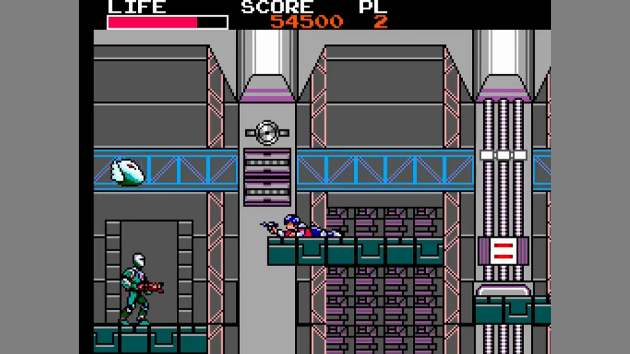 There are two gameplay modes which alternate between stages. There are stages with horizontal auto-scrolling where you ride a bike called Tri-Formation. The bike can also transform into a flying mech. You can jump and fire in bike mode. Collecting Z symbols will increase your fire power. In the other stages, you walk around on foot. The game does not auto-scroll in these stages. You can jump and shoot. There are no power-ups to found in these stages, and they end with a boss fight.