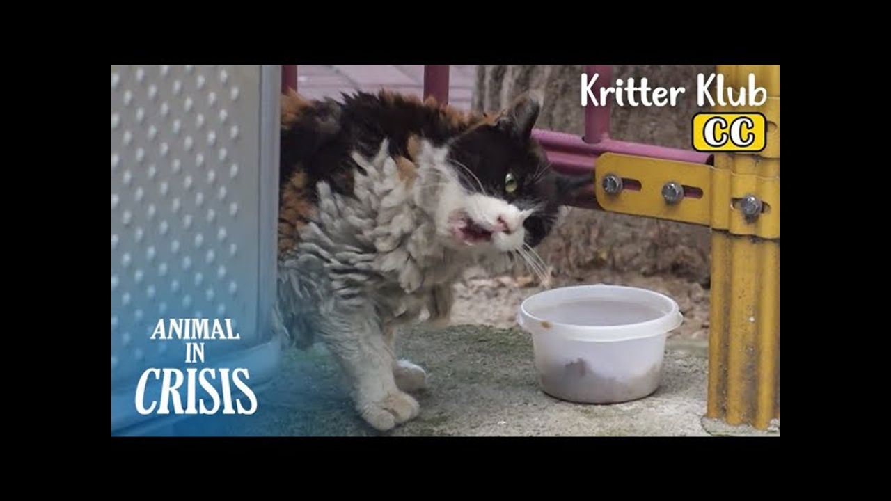 A stray cat with seriously matted fur was spotted on a street. Following after the cat, we saw a young girl feeding the cat. However, the cat is struggling to chew or swallow the food. What's wrong with her? We dispatched the rescue team immediately.
