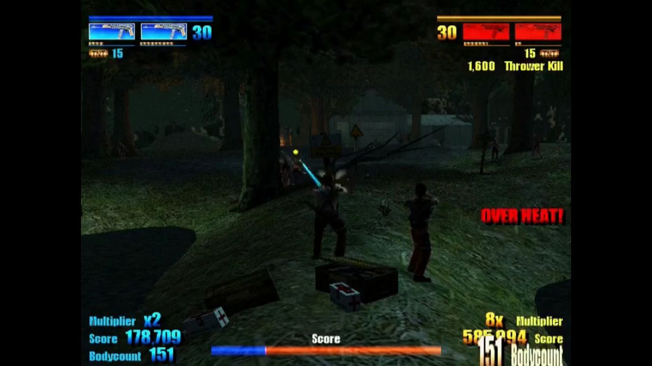 You can choose to play either Fortman or Valdez. The other character will either be controlled by the CPU or another player in co-op. Both characters will move automatically. You only control the arms for aiming and shooting. Each arm is controlled with one of the twin sticks. You can activate and deactivate a gunlock to make your character aim both guns in the same direction. In this case, you use only one stick. After a few stages, you can select several weapons during the game with the directional buttons. However, ammunition is limited for the stronger weapons. If one of the characters dies, you get set back to the last checkpoint.