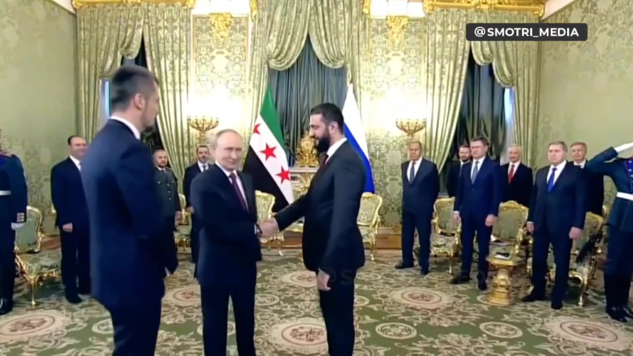 The first handshake between Vladimir Putin and Ahmed al-Sharaa in the Kremlin.