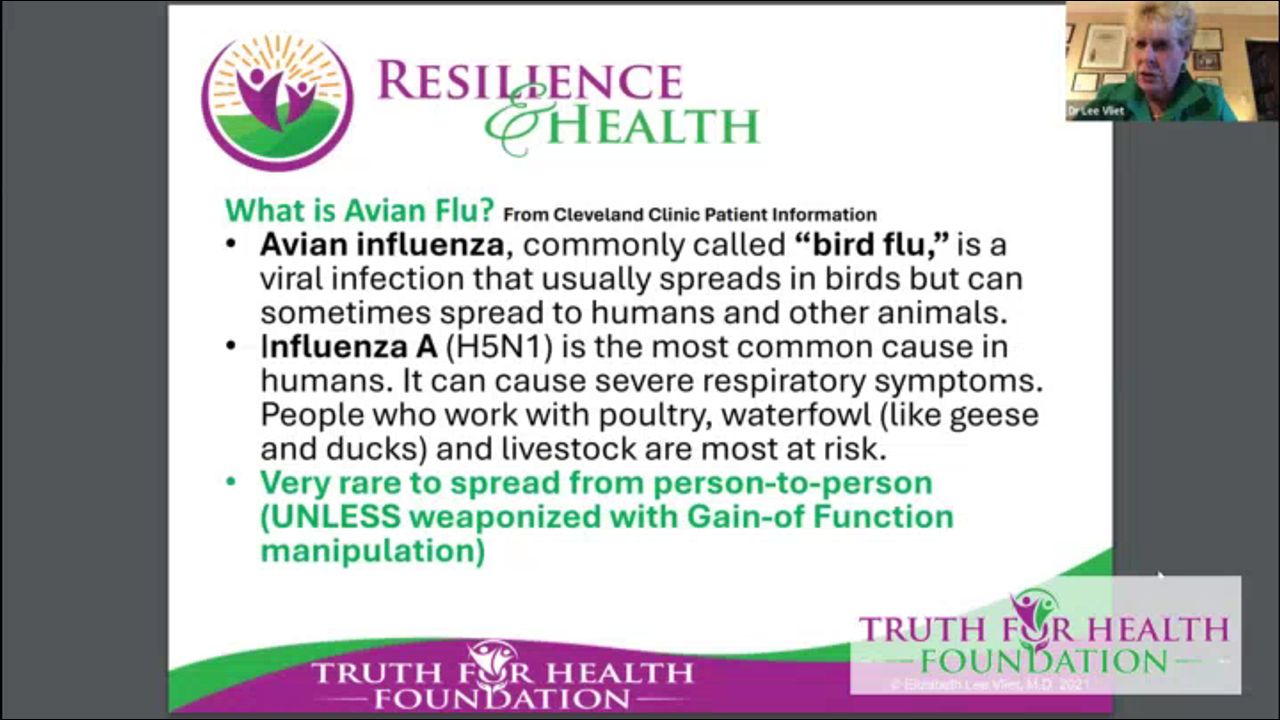 6/18/24: The “Avian Flu” Hoax: Strategies to Combat the Propaganda of Fear Speaker: Elizabeth Lee Vliet, MD
