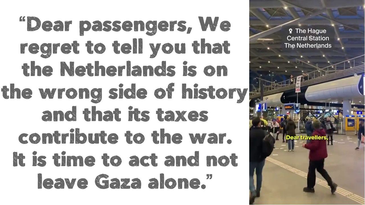 Loudspeakers at The Hague train station - Netherlands: amazing. Nice one. “Dear passengers, We regret to tell you that the Netherlands is on the wrong side of history and that its taxes contribute to the war. It is time to act and not leave Gaza alone.”