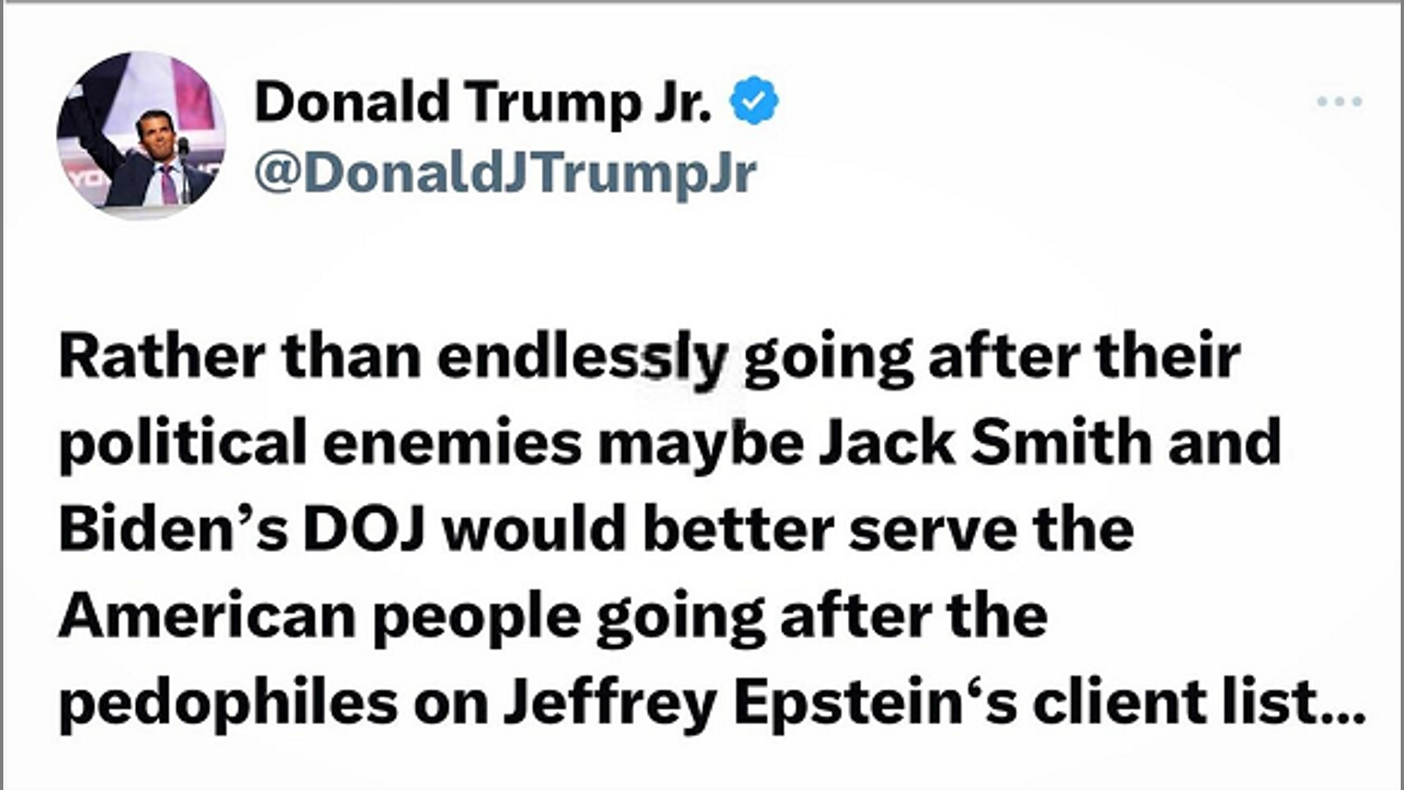 Mirrored from https://rumble.com/v30xh3o-don-jr.-jack-smith-and-bidens-doj-should-be-after-the-pedophiles-on-epstein.html
