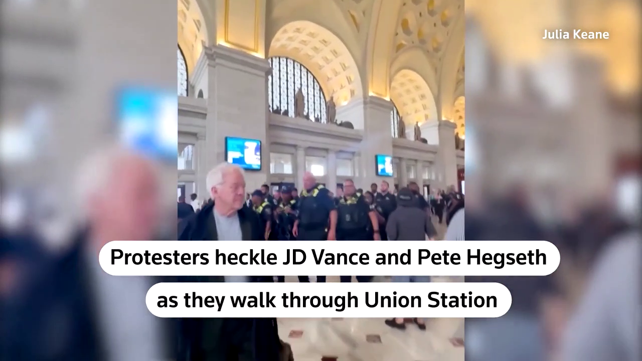 Protesters chant ‘from Washington to Palestine, occupation is a crime’ as JD Vance and Pete Hegseth face demonstrations in Washington DC.