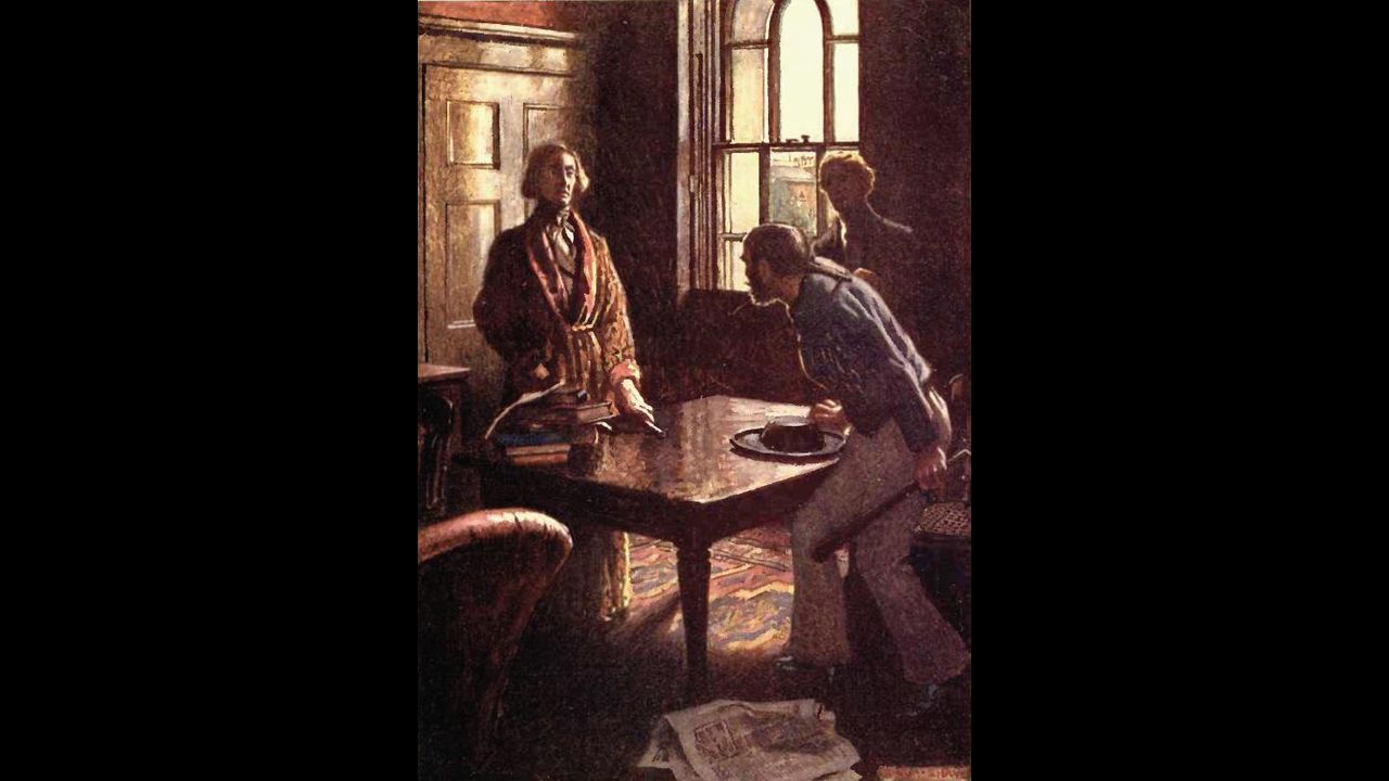 The picture used is "The sailor's face flushed up; he started to his feet and grasped his cudgel" by Byam Shaw for "Selected Tales of Mystery" (London : Sidgwick & Jackson, 1909)