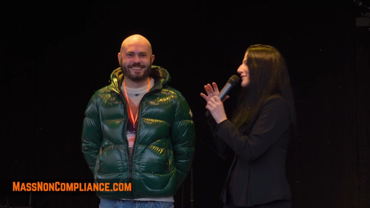 Italian Activist and Founder of '100 Georni da Leoni' (100 Days of Lions) @centogiornidaleoni Riccardo Rocchesso speaks in London at the Mass Non-Compliance Protest against Digital ID on 13th December 2025.