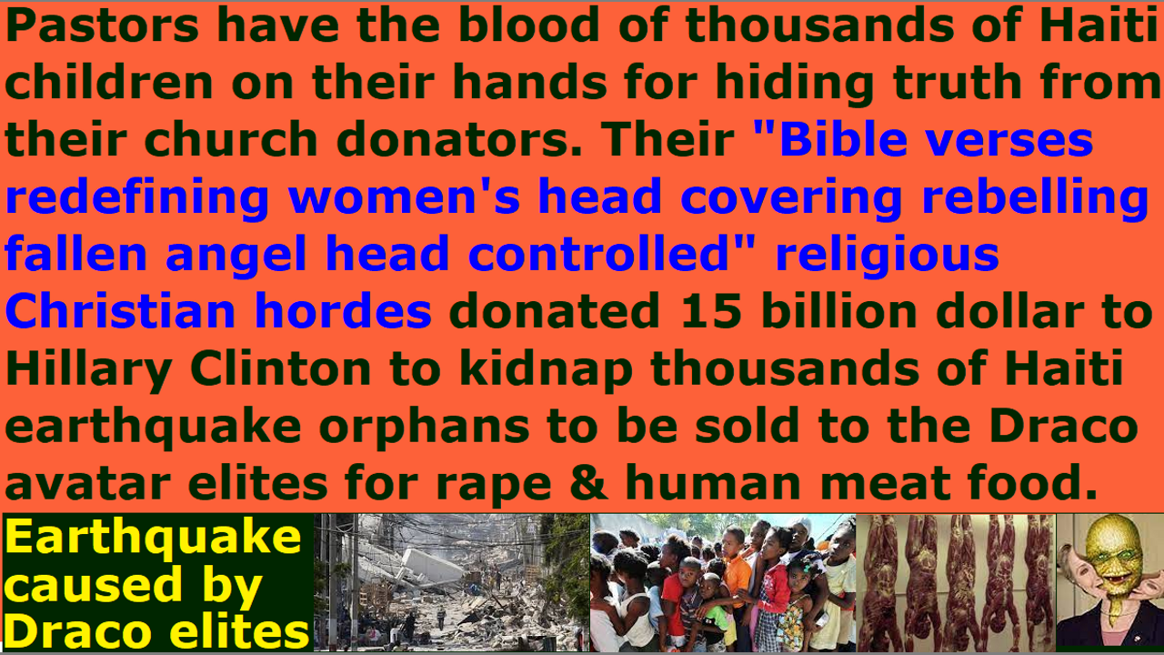 *** Intelligence news update from the Human Homo-Sapiens Race Survival Resistance (HRSR) headquarters and Republic Rebel Alliance battlefront (January 2023). The Western feminist nations’ “church donators loving” “truth hiding” pastors have the blood of thousands of Haiti children on their hands for hiding the truth from their church donators. Their "Bible verses redefining women's head covering rebelling fallen angel head controlled" religious Christian hordes blindly donated 15 billion dollars to Hillary Clinton’s Foundation, so that Hillary Clinton can kidnap thousands of Haiti earthquake orphans to be sold to the Draco reptilian chimera fake aliens incarnate avatar elites for torture & lesbian rape (peg) & satanic sacrifice human meat food. The earthquakes and tidal waves are caused by the Draco reptilian chimera fake aliens incarnate avatar black nobility families and their reptilian hybrid globalist elite pedophile cannibal Satanist Pedogate Pizzagate “White House Pizza Night” New Age Wicca witch genocidal psychopathic feminists to collect human orphans for human trafficking. This has been going on for thousands of years since Noah’s Atlantis days, just like they cause the wars for human meat food and human laboratory specimens and human child sex slaves and human satanic sacrifice rituals to be wormhole portaled to their Draco Prime planet on Alpha Draconis. The Draco Empire space fleets are the third level of hell’s minions in Satan Lucifer’s kingdom. The pastors are hiding all of this and covering up Satan Lucifer, because they do not want to receive assassination attempts and be ridicule by their church donators as lunatic heretic idiotic narcotic maniacs, just like Jesus was ridiculed as being crazy. They are attacking my throat with an itchy scratchy throat attack now to try to make me cough. They do not like my daily sermon I am writing right now. The earth’s hidden matriarchal rulers New Age Wicca witch Pedogate Pizzagate “White House Pizza Night” LGBTPB (lesbian gay bisexual transvestite pedophile bestiality) orgy child sex magick ritual pedophile cannibal Satanist genocidal psychopathic feminists kidnap & torture & lesbian rape (peg) & satanic sacrifice & eat 12 million children every year and throw their leftover human meat & bone ashes into the supermarket groceries & church food & restaurant food. The religious Christian hordes are also hiding this from their 6 billion neighbors, when Jesus commanded us to love our neighbors and the children. They are afraid of assassination attempts and ridicule by their coworkers and friends and bosses and clients and customers. Satan Lucifer’s religious system’s “ordained & allowed & trained & non-assassination-attempt-receiving” fake job position “pastors” are hiding all of this, because they do not want to lose church donators and lose fake post-1873 unbiblical 10% salary illegal tithe income taxes. They are not only crooks who steal illegal income tax, but they are also Satan Lucifer’s cover-up agents who cover up all the truths from their church donators and the 6 billion humans. Preach this in your next Sunday church service sermon, so that 99% of your church donators will leave your church in anger & disgust & terror, so that God’s house will be cleansed of their religious filth. Do it now and do not wait until tomorrow, unless you are a crazy lunatic who has lost all common sense of the Holy Spirit. Repent and receive Jesus as Savior, and make straight the way of the Lord!