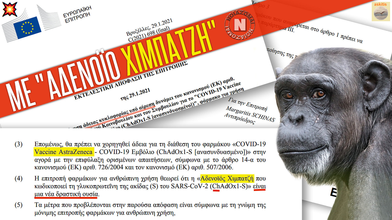 Σύμφωνα λοιπόν με επίσημο έγγραφο της Ευρωπαϊκής Επιτροπής, που συντάχθηκε στις Βρυξέλλες στις 29-1-2021 και αφορά "Εκτελεστική απόφαση της Επιτροπής για χορήγηση άδειας κυκλοφορίας υπό αίρεση" στο εμβόλιο της Astra Zeneca (AZD1222 - το οποίο πλέον, μετά το φιάσκο, μετονομάζεται σε "Vaxzevria" - Βαξζέβρια), στην παράγραφο (4) του σκεπτικού της απόφασης, αναφέρεται η ύπαρξη "αδενοϊού Χιμπατζή":
