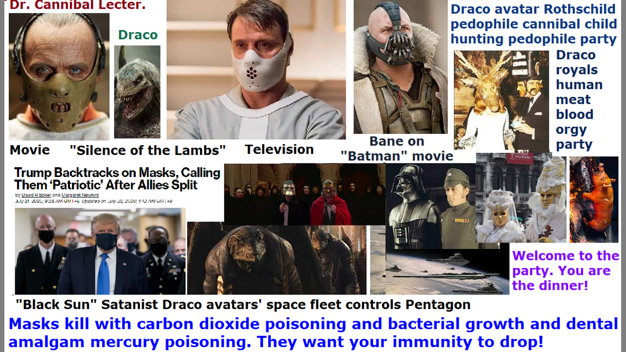 *** Intelligence news update from the Human Homo-Sapiens Race Survival Resistance (HRSR) headquarters and Republic Rebel Alliance battlefront (April 2021). Masks for COVID-19 are for aid in killing and depopulating 99% of the earth’s populace. Satan Lucifer and his Illuminati top hierarchy “White Lodge Brotherhood” ascended master fallen angels and their nephilim & chimera alien incarnate avatar globalist elites are not only using mask as a PSYOP for subjugation and control, and feeding on that tasty low-vibration life force energy of the humans’ depression and suicide and hopelessness and fear and trauma, although masks are useless to keep out virus, but they are using it to slowly kill the human homo-sapiens specie with carbon dioxide poisoning and bacteria growth and dental amalgam mercury vapor breathing to lower the humans’ immune systems. The humans and all their rival factions like the Asian dragon families and Kimmy and the Pleiadians’ Russians will all be more vulnerable to their Elon Musk’s 42,000 satellite electromagnetic field AI neurolink network 5G remote assassination DNA targeting weapons, without them even knowing that they are being Nazi eugenics depopulation genocide killed. If you have been nasal swab COVID-19 tested by them or donated blood or had an MRI or had a blood test in your life, they have your DNA information. Masks are intentionally being made with poisonous plastic fiber glass that gets accumulated in the humans’ lungs and cause cancer and respiratory diseases. They were also passing out masks with Coronavirus, in order to infect the humans and spread the disease and increase depopulation COVID-19 numbers. They are very smart, but very sinister, and psychopathic. However, we real Christians prayed and stopped the huge mass murder genocide, up to now. Once the Holy Spirit in us real Christians is finished warning the dumb wicked human populace, and we are raptured into heaven, and Noah’s ark door closes, then God’s judgment wrath begins, and Satan Lucifer and the Illuminati NWO AntiChrist will start killing off large numbers of the earth’s populace with either COVID-19 5G weapons or by changing them into chimera zombies with their “Mark of the Beast” gene-altering vaccines (a form of soul death). The Western feminist nations’ “Bible redefining” “women’s head coverings rebelling” “Satan Lucifer’s 1840s to 2020s cross-dress-project men’s trousers wearing” “10% salary tithe taxing” religious Christian human women should not assume that their Jezebel goddess and their Pedogate Pizzagate “White House Pizza Night” pedophile cannibal Satanist lesbian orgy child sex magick spirit cooking ritual Draco reptilian chimera alien incarnate avatar Illuminati NWO New Age Wicca witch feminist leaders are going to let them live, because they will treat the human women as equals with the men to be depopulation exterminated as “useless eaters” and “no longer needed feminists for the human replacement program child sacrifice abortion energy wormhole portal opening return of their dead disembodied nephilim & chimera alien demon spirits and their fallen angel alien fathers from the abyss where God had imprisoned them.” They do not wear “women’s head coverings” so their heads are controlled by the fallen angels, and they have no idea what we real Christians are talking about, and they think we are talking in some kind of parable nonsense. Their rebellion will kill them, for the sin of rebellion is the same as the sin of witchcraft. Here is wisdom for you, for those who hear. End of transmission…