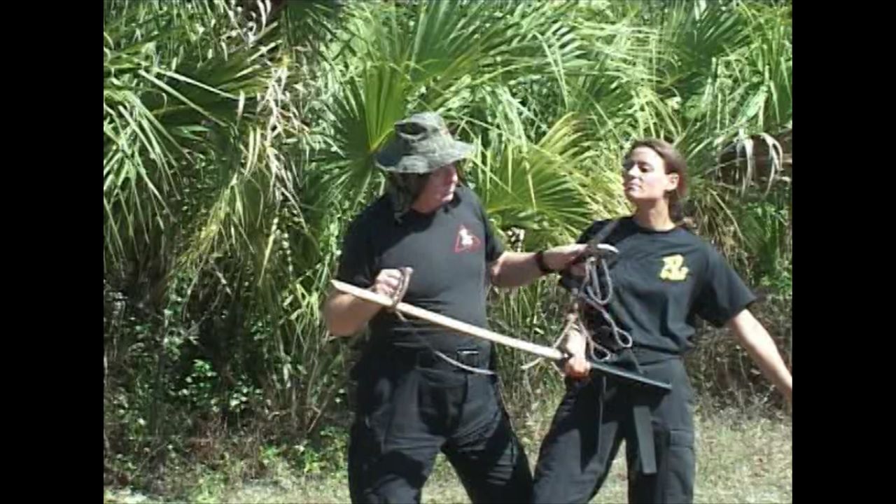 Shidoshi Severance introduces and demonstrates the use of a unique double-edged blade, attached to roughly 18 feet of rope, or chain, ending in a large metal ring, used to block a sword attack and to ensnare and incapacitate an opponent.