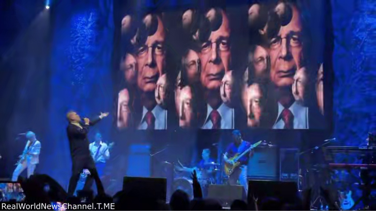 He sang about ‘criminals’ as he pointed to images of Klaus Schwab on the screen alongside images of Gates and Fauci.
