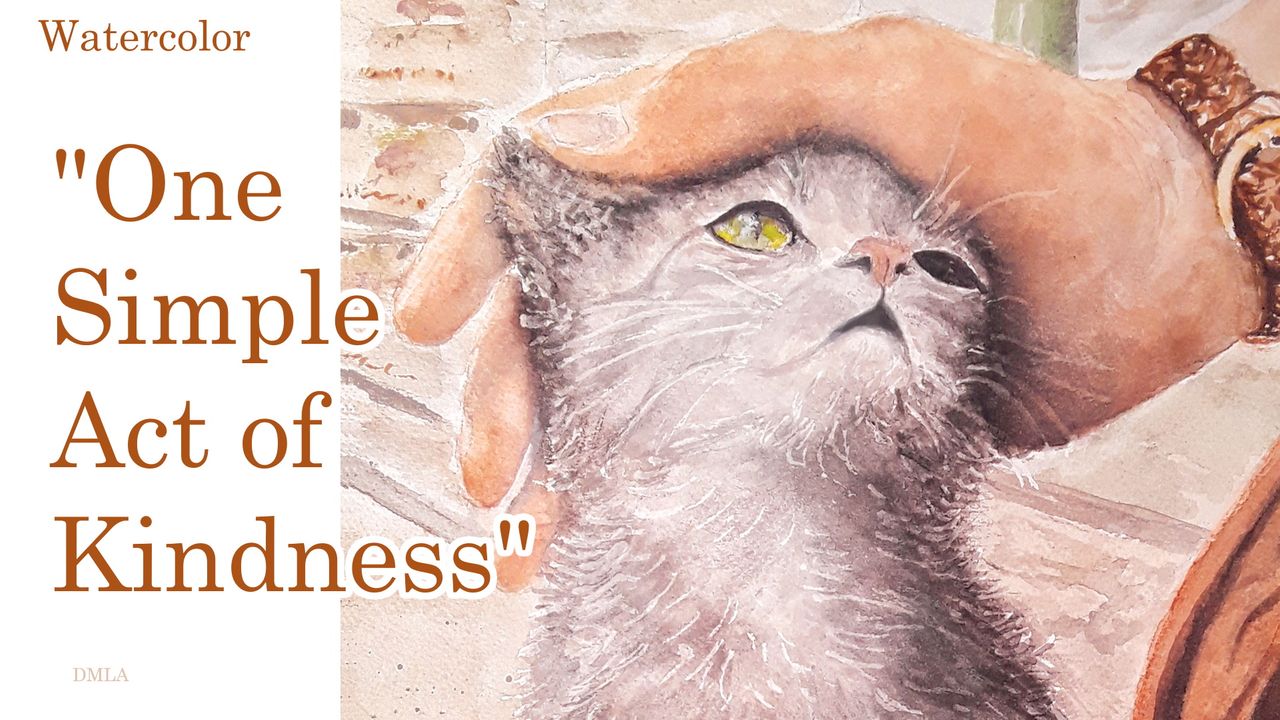 I call this painting, "One Simple Act of Kindness". This was the first cat I've ever painted. This was a fun way to practice and get more experience with watercolor. Now I'm not intimidated to paint more furry cats, well, not as much. (I'm still learning how to use watercolor).