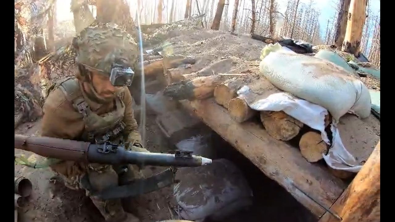 POV combat footage of foreign mercenaries - either American or Canadian - fighting alongside Ukrainians in an unknown location on the front.