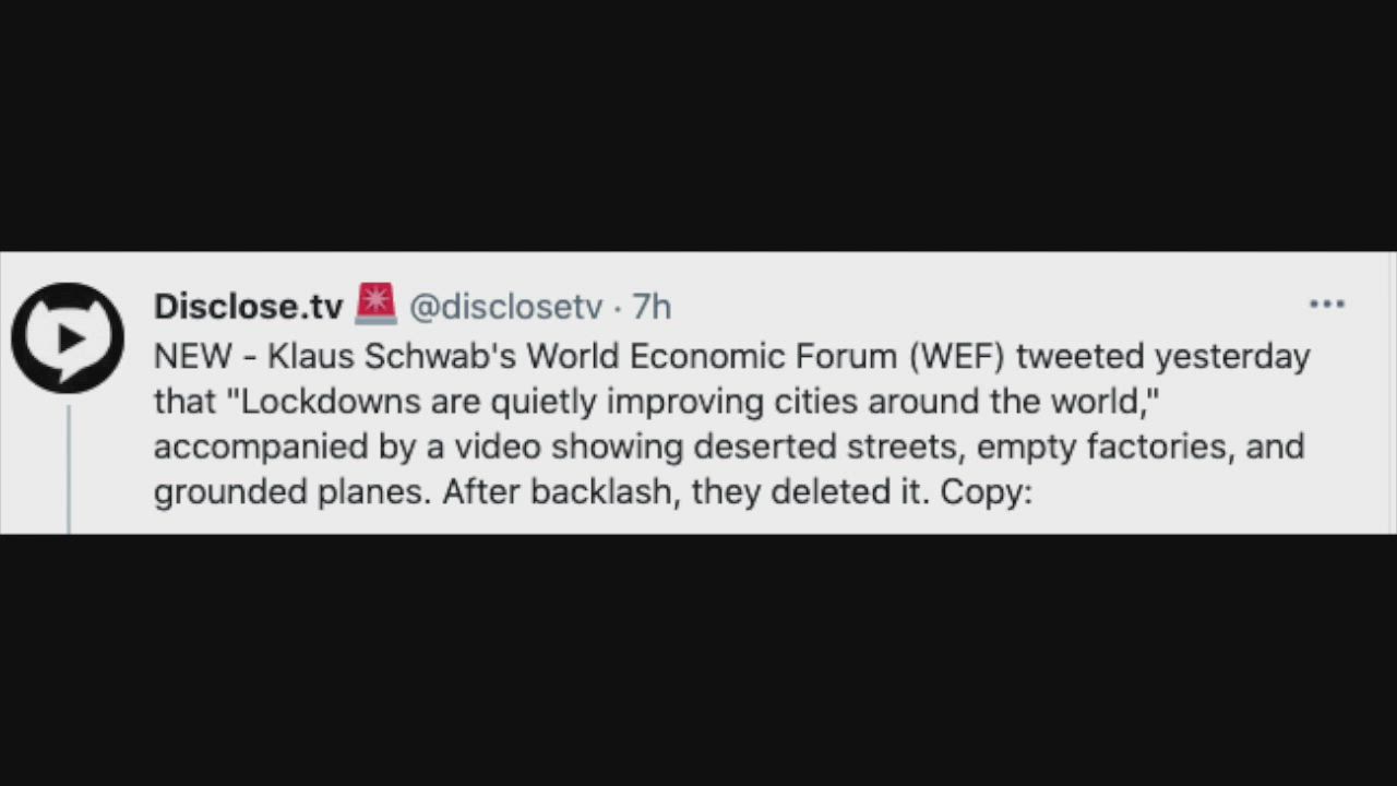 Klaus Schwab's World Economic Forum (WEF) tweeted yesterday that "Lockdowns are quietly improving cities around the world," accompanied by a video showing deserted streets, empty factories, and grounded planes. After backlash, they deleted it.