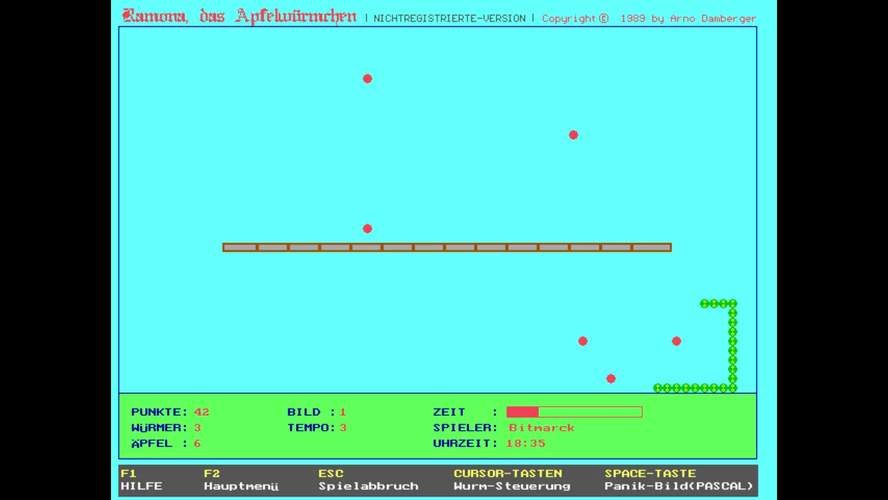 Ramona das Apfelwürmchen (Romand the Little Apple Worm) is an arcade game developed by German programmer Arno Damberger and released as a shareware game. Damberger wrote the game to learn C and to contribute it to a competion held by boeder, a German company publishing software, computer supllies and accessories.