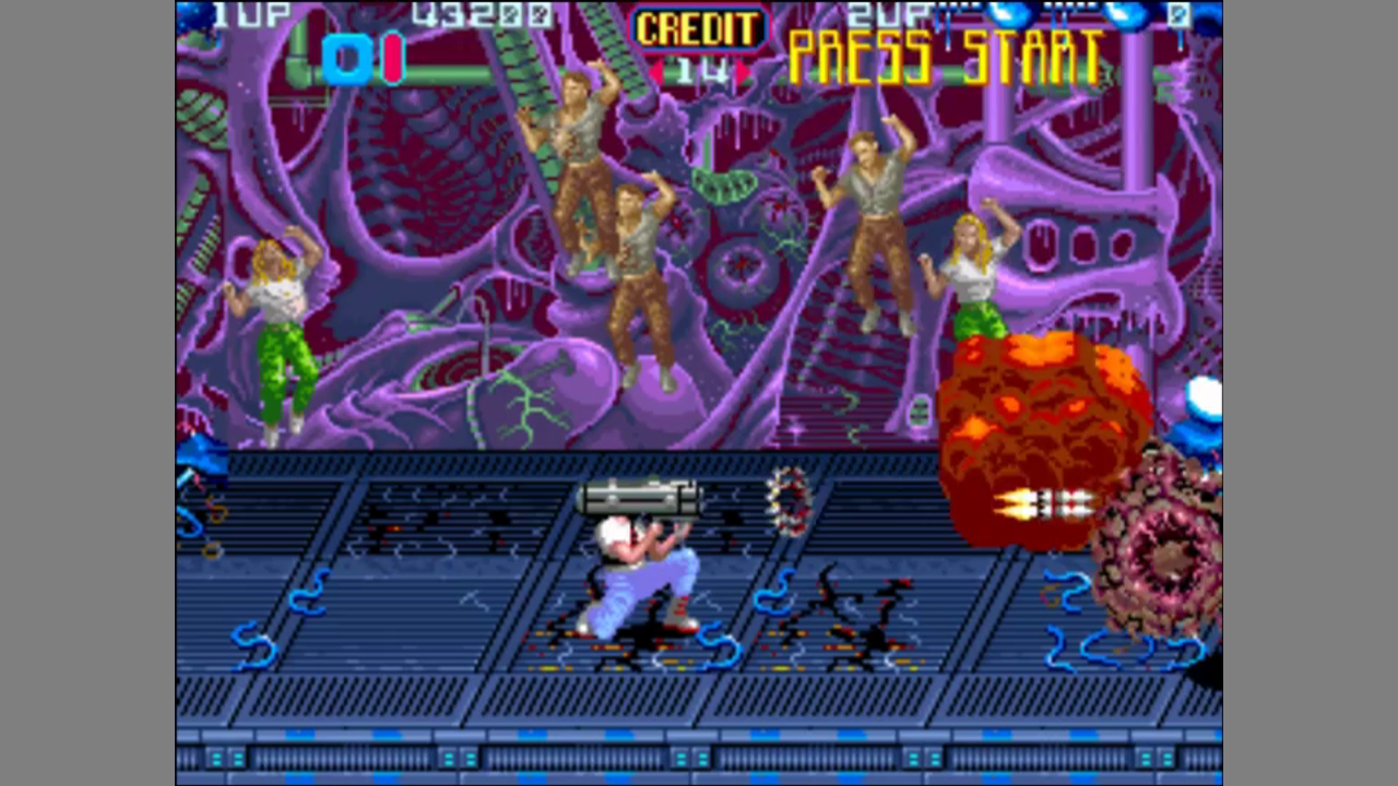 You are armed with a heavy machine gun with rapid fire and infitite ammo. You can shoot standing or crouching and move while you're shooting. If you're crouching, you move more slowly. Some enemies, e.g. Facehuggers, can only be hit when you are crouching. Thre is a weapon power-up which cycles through various types until you pick it up. Extra weapons include a 3-way shot, missiles or a flawthrower. Extra weapons also have infinite ammo, but are lost when you loose a life. There are also secondary weapons like bombs which you can throw. You can also find food (restores health) and extra lives.
